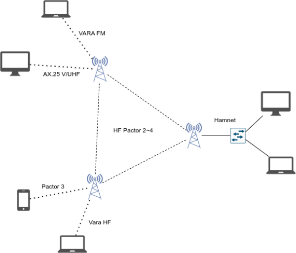 Le terme “réseau hybride” désigne les points d'accès qui prennent en charge l'acheminement de messages en HF. Ces points d'accès restent connectés au réseau internet, lorsque de la connectivité est disponible. Dans ce cas, une connexion client est relayée à un des serveurs de messagerie centraux. Toutefois, si la connexion vient d'un autre point d'accès, qui relaye des messages purement radio, le point d'accès gère elle-même le traitement du message plutôt que de le transmettre à un CMS, à travers Internet. Les messages entrants sont stockés dans une base de données locale.